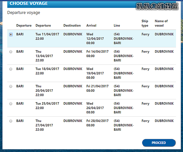 從我抓出來的時刻表就可以發現原來2017年只有從4/11星期二開始才有渡輪可以搭到DUBROVNIK (杜布羅夫尼克),固定的班次是星期二、星期四。