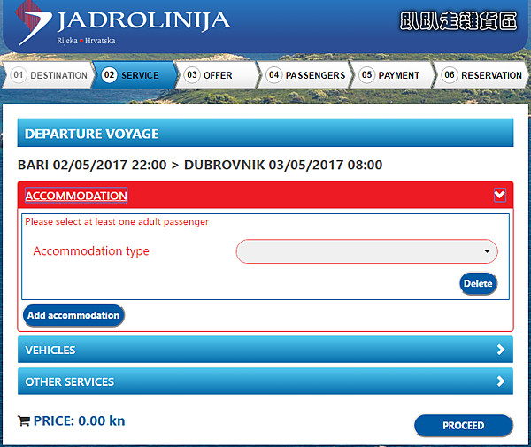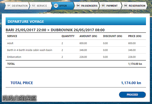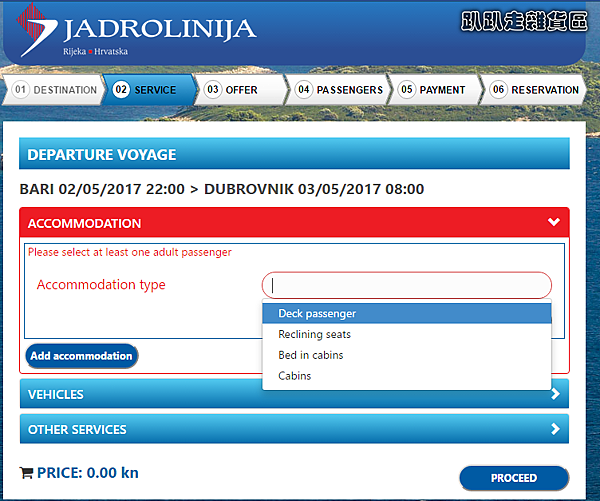 我有試算了一下,如果選擇"Deck passenger" 一個成人票價是 414 kn, 差不多是台幣1863元。
