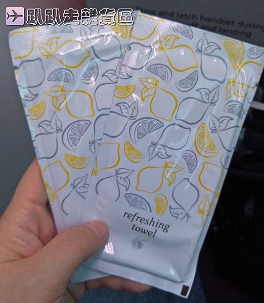 另外,卡達航空跟阿聯酋航空相同一上飛機就會先給 Refreshing towel. 只是這味道很像廁所芳香劑~ 雖然我是沒有拆開來擦手,但還是覺得蠻有趣!