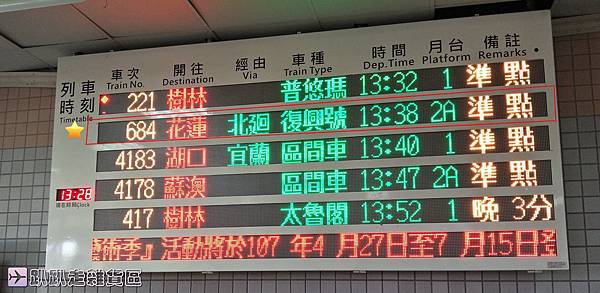 我們原本預計是要搭 14:41 的區間快車。我們在火車時刻表的看板上看到 13:38 復興號往花蓮,我們原本想早一點到花蓮還可以有時間休息一下再去走走,就到售票櫃台問說我們可以用聯運票加價搭復興號嗎?沒有想到站務人員就跟我們說不用加價,而且有座位。真的是太棒了!!只是, 我們就必須繼續讓肚子空空,因為羅東火車站後站沒有什麼可以買來覓食的。其實應該是說天氣熱,吃不下就特別會挑食物,沒有辦法隨便亂買啊~