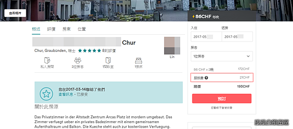 再加上 Airbnb 收取的服務費 21 瑞士法郎, 這樣二晚的房價就要193 CHF (瑞士法郎)