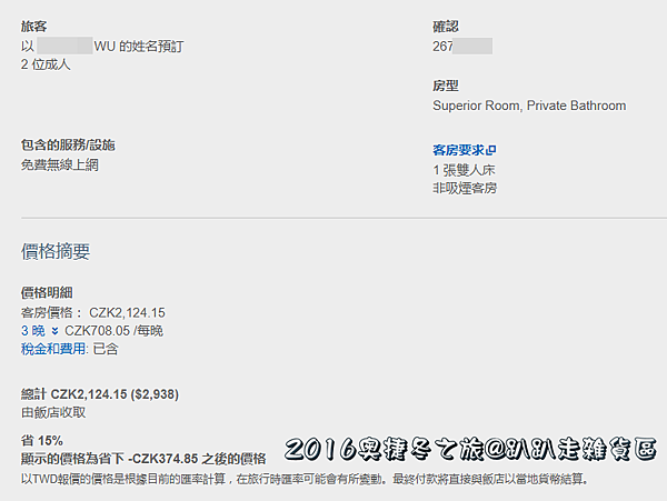 住宿三晚的房價為CZK 2124.15, 入住時付款。我們在check-in時和飯店人員和飯店人員詢問了一下如果付歐元是要付多少呢? 因為CK 是我們在捷克的最後一站了,我們身上不可能帶太多的捷克克朗,畢竟最後還是要回到維也納。
