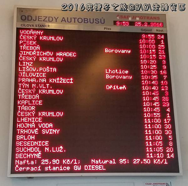 之前就有說過我們住的飯店離車站非常近,一到車站照舊就是去看下車班及月台資訊。我們就是要搭10:20出發, 在第三月台往Cesky Krumlov 庫倫洛夫。