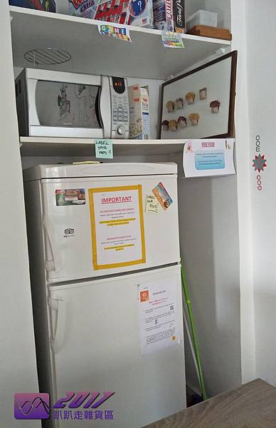 ▼微波爐跟冰箱。放到冰箱的私人物品,都要用便利貼寫上自己名字貼上去後再放到冰箱,如果沒有名字的物品就是屬於「公用」品,被別人拿走也就沒有辦法囉!